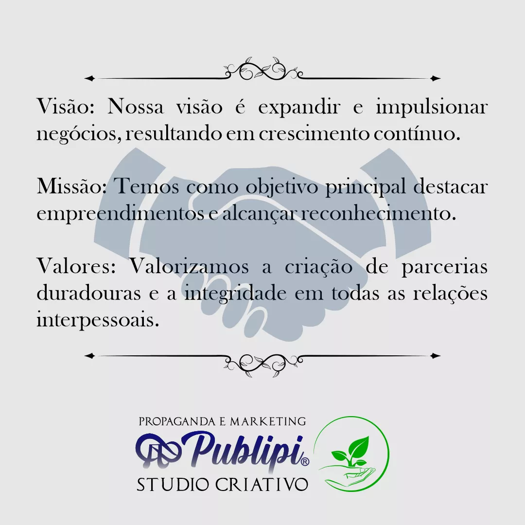 "A Publipi é uma empresa especializada em marketing digital. Nosso objetivo é auxiliar indivíduos e organizações a se conectarem e crescerem, por meio de estratégias criativas que se adaptam às necessidades de cada cliente. O marketing de marca deve ser integrado de forma integral em qualquer estratégia de negócios. Nossos serviços de marketing online incluem design de websites, gerenciamento de mídias sociais, otimização de mecanismos de busca, entre outros. Somos uma agência Full Service, que oferece soluções completas de publicidade e marketing. Nossas áreas de atuação abrangem branding, comunicação e design. Se você deseja obter mais informações, entre em contato conosco. Estamos à disposição para atendê-lo."